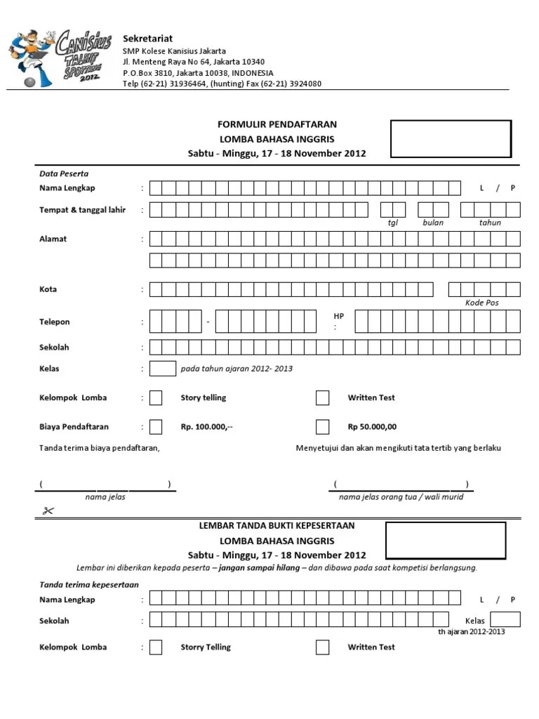 Posting Komentar untuk "Contoh Formulir Pendaftaran Les Bahasa Inggris - Contoh Formulir Dalam Bahasa Inggris - 17.09.2021 · dalam kesempatan ini kita akan membahasnya kembali sebagai review untuk menyegarkan kembali ingatan kita dengan materi yang satu ini, namun kali ini admin tidak akan membahas semuanya hanya akan memberikan beberapa contoh dari t eks announcement, semoga ini dapat membantu kalian dalam membuat pengumuman dalam bahasa inggris, selamat membaca ya."